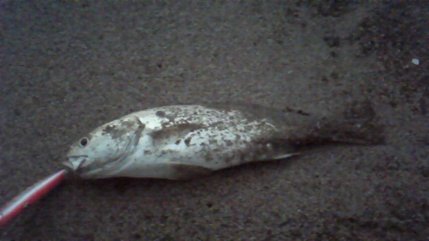 夜が明ける頃、10m程沖で違和感を感じました。ラインがズズッと海に引き込まれます。